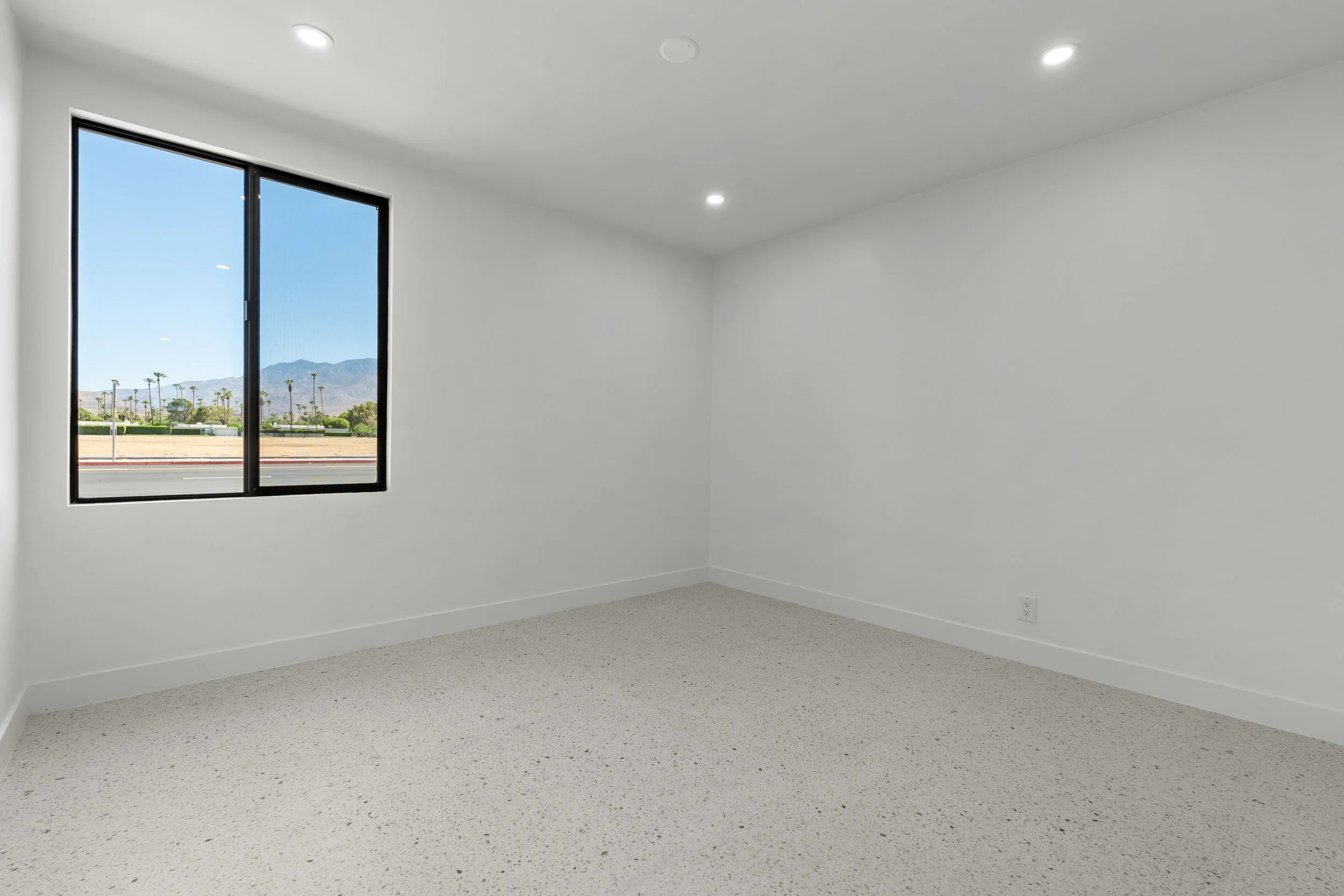 Empty bedroom and closet with white walls and terrazzo tile floors, open window showing outdoors.